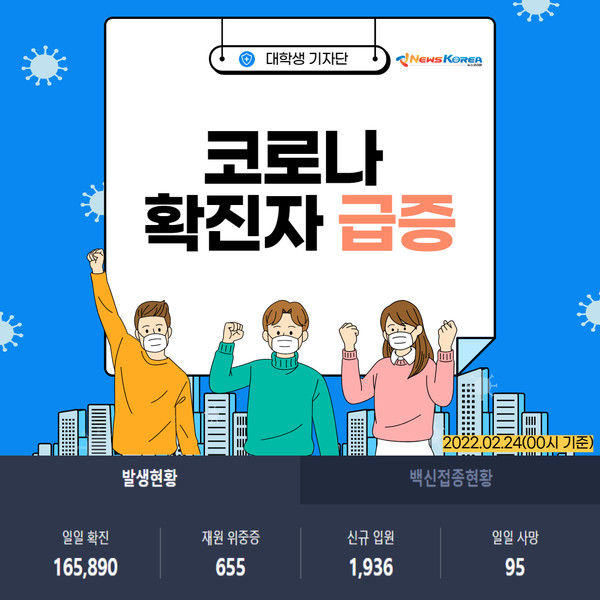 (서울=뉴스코리아) 배영주 기자 = 2월 24일(0시 기준) 신규 확진자 수는 16만 5890명, 위중증 환자 655명, 사망자 95명으로 위중증 환자와 사망자가 많이 나오고 있다.