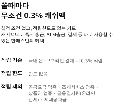 한패스의 다른 서비스로는 한패스 카드가 있다. 한패스 카드는 한패스 월렛과 연동된 선불 카드로, 해외 VISA 결제가 가능하고, 레일플러스 교통카드로 이용할 수 있다. 한패스 카드의 결제 혜택은 국내/해외 결제 금액의 0.3% 캐시백이고, 이는 결제와 동시에 월렛으로 지급된다.