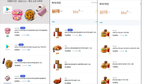 커피, 푸드부터 생활, 상품권까지 다양한 브랜드의 상품이 입접되어 있다. 게다가 고마운 마음, 사랑한 마음, 응원한 마음 등을 전하기 위해 추천선물도 참고하여 선물할 수 있다. 간단하게 이용할 수 있으며 현재 오픈 이벤트에 따라 일부 제품의 한해 최대 38% 특가 할인 진행중이다. 이벤트 상품은 주차별로 상이하니 자세한 내용은 한패스 앱에서 확인 가능하다.