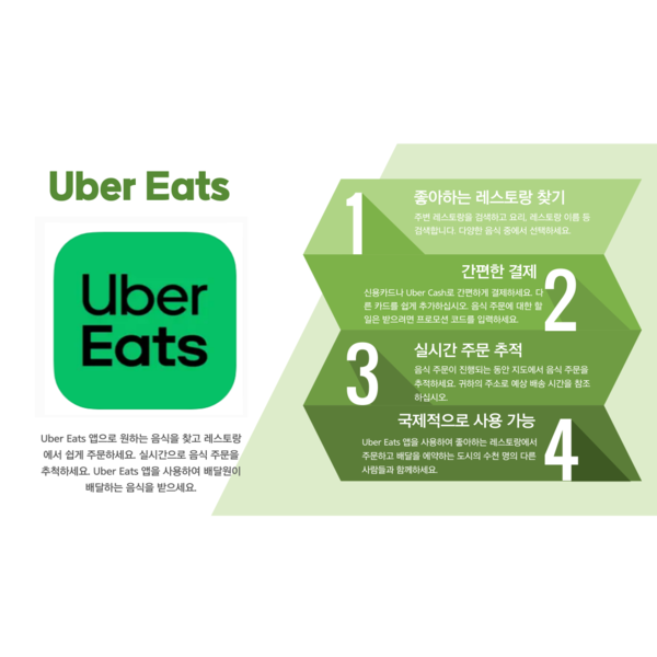 Uber Eats는 원하는 음식을 찾고 레스토랑에서 쉽게 주문을 할 수 있으며, 실시간으로 음식 주문을 추적하여 예상 배송 시간을 참조할 수 있다.