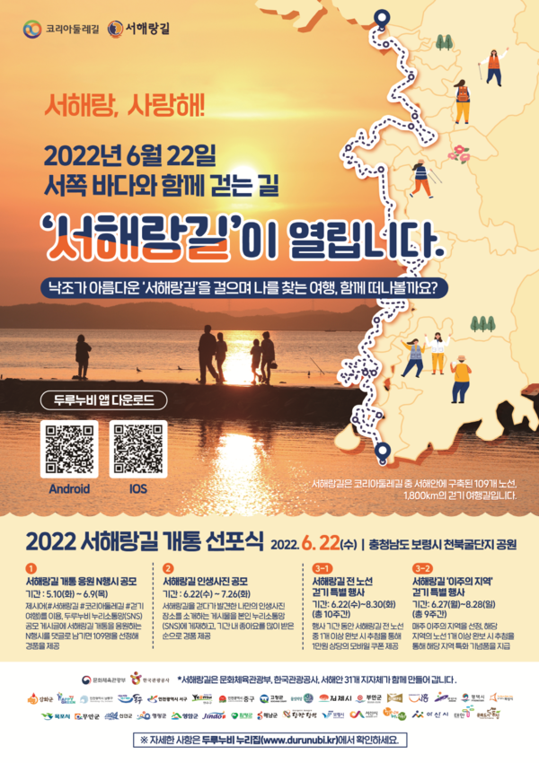 (서울=뉴스코리아) 박범수 기자 = 한반도 서해안을 연결하는 국내 최장거리 걷기여행길인 ‘서해랑길’이 6월 22일 정식 개통했다.