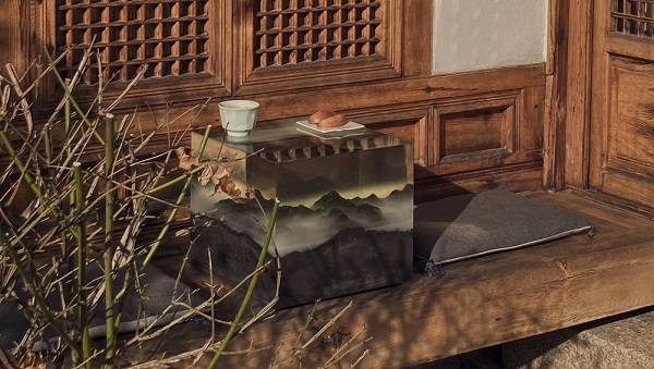 산수화에서 자연경관을 바라보고 그림을 그리는 세 가지 방법인 '삼원법(三遠法)' 중에서 산을 위에서 아래를 내려다 보며 그려내는 기법인 '심원법(深遠法)'을 이용해 산과 자연의 깊고 깊은 모습을 테이블에 담았습니다.
