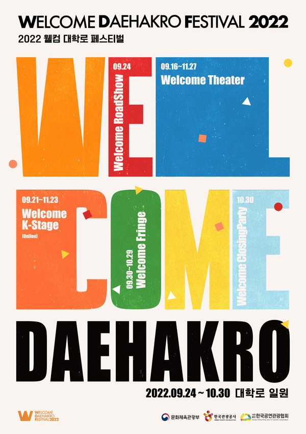 한편 본행사인 ‘2022 웰컴 대학로’의 공연과 콘텐츠도 더욱 풍성해졌다. 역대 가장 많은 150여 개의 작품이 참여하는 가운데 축제의 시작을 알리는 ‘웰컴 로드쇼’를 비롯, 대학로 거리와 공원에서 다양한 공연들을 만날 수 있는 ‘웰컴 프린지’, 한국 연극·뮤지컬을 외국어 자막과 함께 대형 공연장에서 즐길 수 있는 ‘웰컴 씨어터’, 글로벌 관객들이 온라인으로 공연을 즐길 수 있는 ‘웰컴 K-스테이지’ 등 다양한 프로그램들이 마련됐다. 아울러 외국인관광객을 위한 대학로 투어, 대학로 상권 쿠폰 이벤트 등을 통해 대학로 상권의 활성화도 도모할 계획이다.