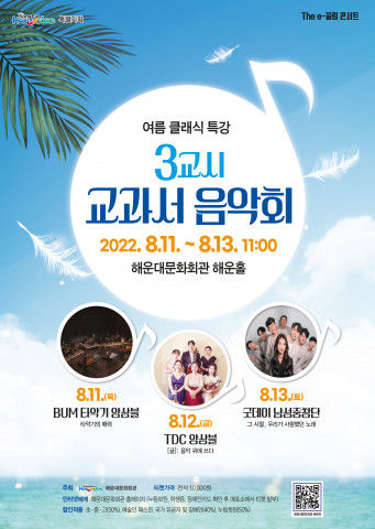 (김해=뉴스코리아) 이건화 기자 = 해운대문화회관(관장 서영지)은 오는 8월 11일(목)부터 13일(토)까지 3일간, 해운대문화회관 해운홀에서 오전 11시 ‘여름 방학 특강 - 3교시 교과서 음악회(이하 교과서 음악회)’ 무대로 관객들을 찾는다.