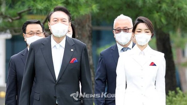 (뉴스코리아=서울) 김은영 기자= 尹-김건희 광복절 경축식..나란히 '태극문양 행커치프' 꽂았다.