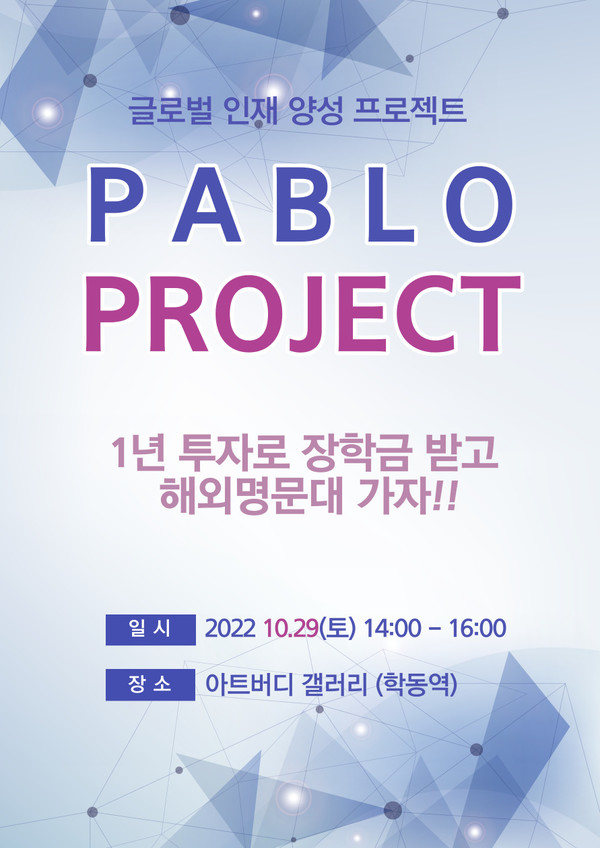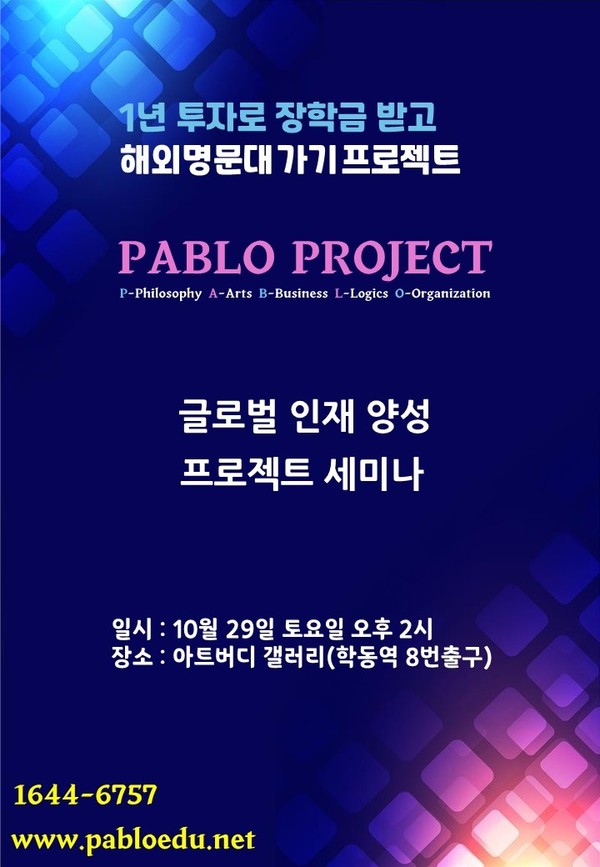 세미나는 10월 29일 토요일 오후 2시에 학동역에 위치한 아트버디 갤럴리에서 진행되며, 홈페이지(www.pabloedu.net) 또는 02-1644-6757 를 통해 사전 참가 신청을 할 수 있다.