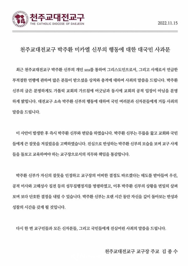 성공회측은 발빠르게 해당 신부를 면직처분했고 눈치만 보던 천주교도 사태의 심각성을 인지했는지 대국민 사과문까지 내걸었다.