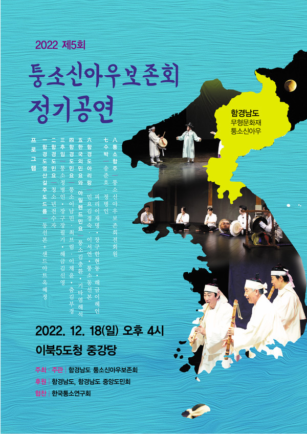 (뉴스코리아=서울) 박지혜 기자 = 2022년 12월 18일(일) 16시 이북오도청(서울특별시 종로구 구기동) 중강당에서 함경남도 무형문화재 제2호 '퉁소신아우'를 알리는 ‘퉁소신아우보존회’의 다섯 번째 정기공연이 열린다. 함경남도 퉁소신아우보존회의 주최·주관, 함경남도 및 함경남도 중앙도민회의 후원, 한국퉁소연구회의 협찬으로 진행된다.