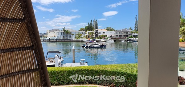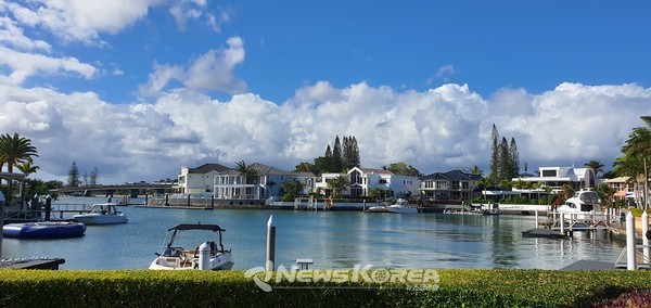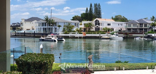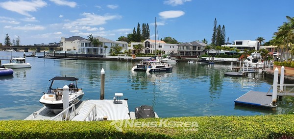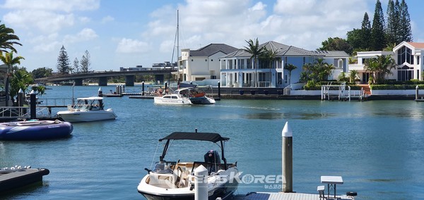 (골드코스트=뉴스코리아) 박복희 특파원 = 호주 골드코스트 파라다이스 포인트(Sovereign Islands in Paradise Point QLD)에 돌고래들과 블랙수완이 관광객들과 함께 한가로이 자연을 즐기고 있다.