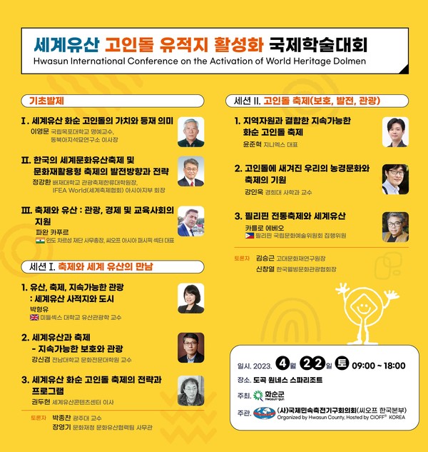 '축제와 세계 유산의 만남 그리고 지속가능한 고인돌 축제의 보호, 발전, 관광'이라는 주제로 열리는 이번 학술대회는 화순군이 주최하고 CIOFF KOREA(씨오프 코리아 / 사)국제민속축전기구협의회 한국본부)가 주관한다.