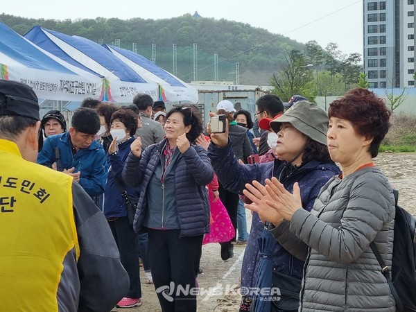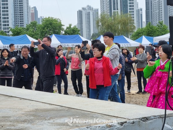 (뉴스코리아=안산) 권순철 기자 = 29일 안산시 관내 팔도향우회 주관으로 첫 개최를 선포한 '안산사랑 팔도향우 한마당' 축제의 현장에서 초청가수와 각 도 출신 향우회장들 그리고 관객들이 흐린 날씨에도 서로 어울리며 무대를 즐기고 있다.