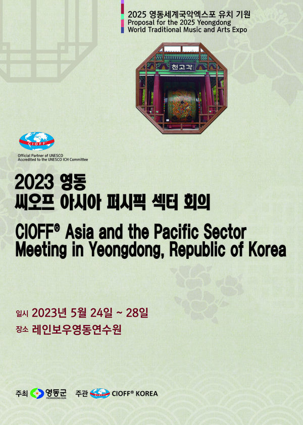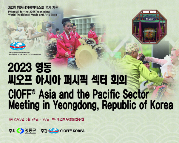 (뉴스코리아=서울) 박지혜 기자 = 2023 영동 씨오프 아시아 퍼시픽 섹터 회의(CIOFF Asia and the Pacific Sector Meeting in Yeongdong)가 2023년 5월 24일(수) ~ 28일(일)까지 5일간 충북 영동군에 위치한 레인보우 영동 연수원에서 진행된다.