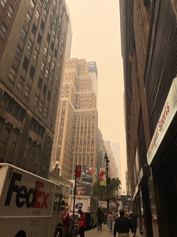 미국 기상청(NWS)의 기상학자 마이크 하디먼은 이날 뉴욕타임스(NYT)에 "마치 화성을 보는 것 같다"며 "대기에서 담배 냄새가 난다"고 말했다. 뉴욕의 하늘이 마치 재난영화의 한 장면처럼 노란 빛을 넘어 갈색 빛을 띈 것은 지난달부터 캐나다 동부 퀘벡주(州)를 중심으로 발생한 산불이 수 백 곳으로 확산하는 과정에서 미국 동부까지 연기가 밀려온 탓이다.
