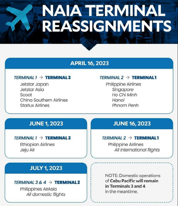 필리핀 이민국은 마닐라 1터미널과 2터미널의 승객들이 공항이용정책 변경으로 3터미널로 몰리는 현상을 감안하여, 출발시각 3시간 전에는 공항에 도착하여 출국수속을 밟을 것을 요청했다.