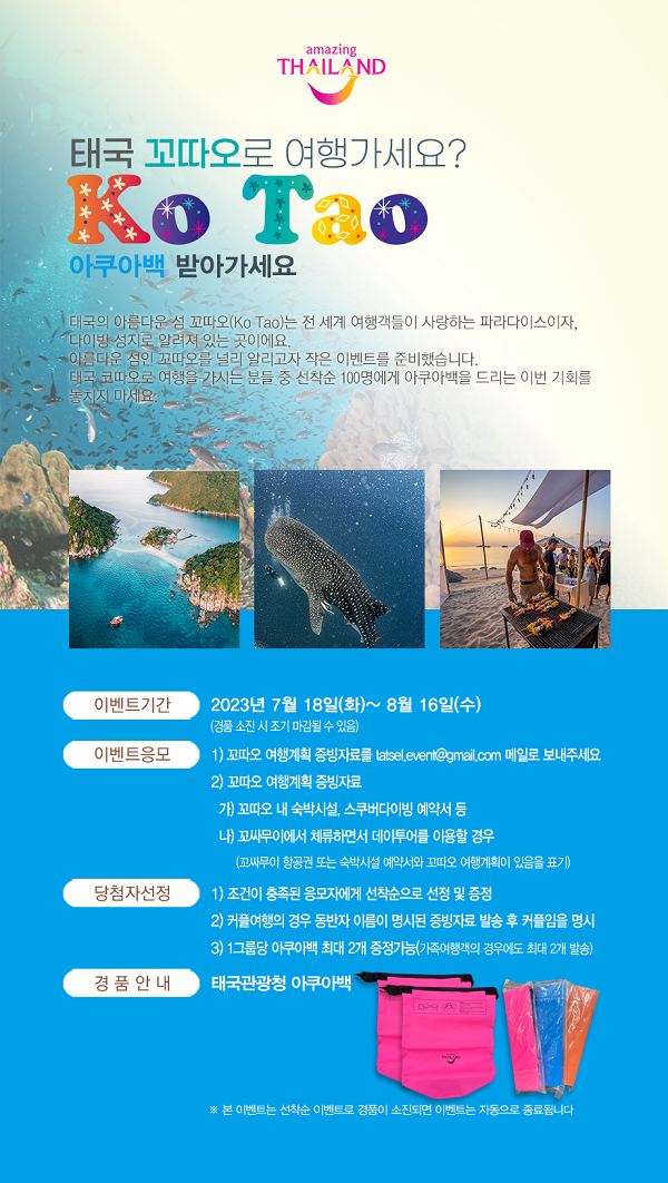 태국관광청이 전 세계 여행객들이 사랑하는 파라다이스이자 다이빙 성지인 태국의 아름다운 섬 꼬따오 여행을 널리 알리고자 여행을 계획하는 이들 중 7월 18일부터 한달 동안 선착순 100명에게 고급 아쿠아백을 증정하는 이벤트를 진행한다.