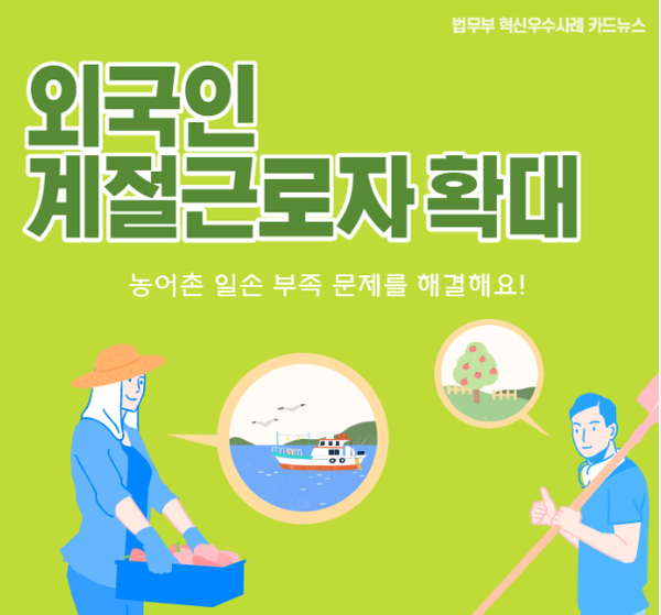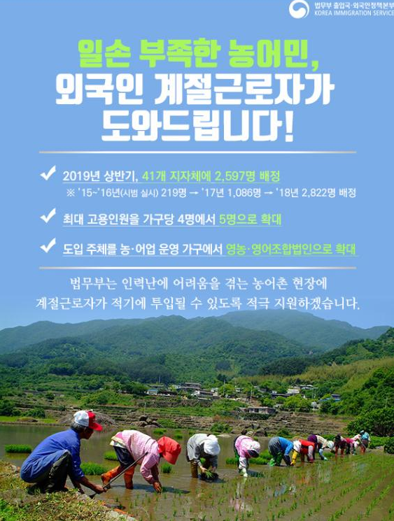 아울러 법무부는 앞으로도 농어업 분야 인력난 해소 노력과 함께 외국인 계절근로자가 인권침해를 받지 않도록 적극적으로 대처해 나가겠다고 전했다.