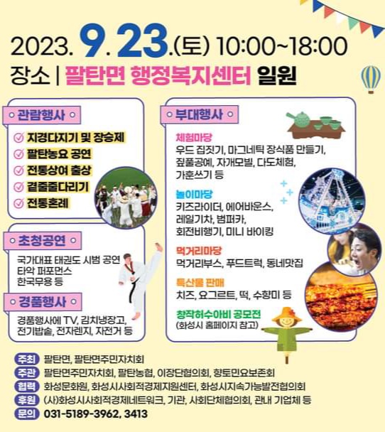 (뉴스코리아=화성) 박지혜 기자 = 화성시(시장 : 정명근) 팔탄면이 2023년 9월 23일(토) 10:00 ~ 18:00 팔탄면 행정복지센터 일원(행정복지센터 앞 특설무대)에서 제 6회 지역전통문화축제 '팔탄신명'을 개최한다.