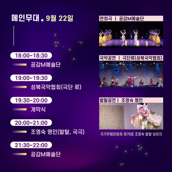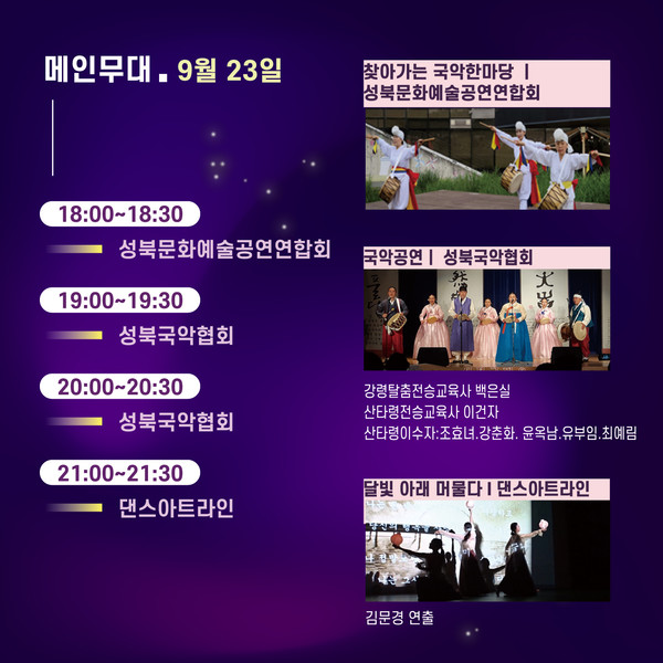 뿐만 아니라 국가무형문화재 예능보유자 조영숙 명인의 발탈 공연을 비롯하여, 성북국악협회, 성북연극협회, 동덕여대 실용음악과, 한성대 역사콘텐츠트랙 등 성북구에 연고를 둔 예술인들의 공연도 거리 곳곳에서 즐길 수 있다. 또한 성북구에 연고를 둔 기관과 단체에서 진행하는 다양한 체험이 마련되어 있다.