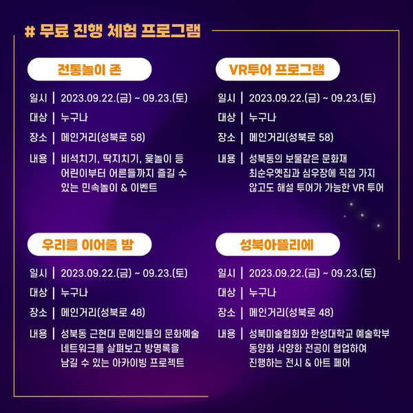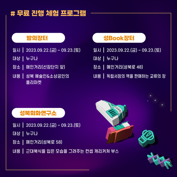 한편 성북미술협회와 한성대학교 예술학부의 미술전공 학생들은 성북구를 그린 작품 등을 전시·판매하는 아트마켓, 독립서점들이 책을 파는 성BooK장터, 플리마켓도 열린다.