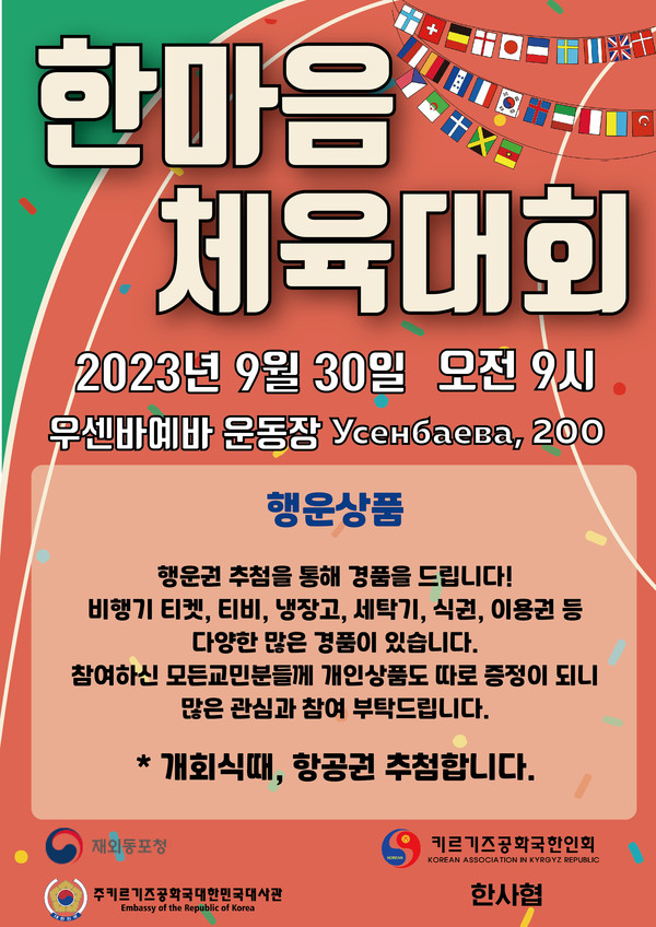 (비슈케크=뉴스코리아) 김상우 특파원 = 키르기즈공화국 한인회는 현지시간 지난 9월 30일 우센바예바 운동장에서 “2023 한마음 대축제”를 개최했다.