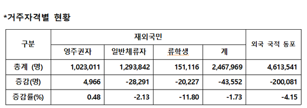 전체 재외동포 중 재외국민은 2,467,969명, 외국국적동포는 4,613,541명으로, 직전 통계 대비 각각 1.73%(43,552명), 4.15%(200,081명) 감소하였다고 발표하였다.