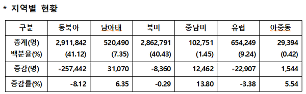 지역별로는 재외동포의 90%가 분포한 동북아, 북미, 유럽 지역에서 재외동포의 수가 감소한 가운데, 코로나19, 경기침체 등의 요인으로 중국 내 재외동포 수가 크게 줄어 동북아 지역의 감소 폭이 –8.12%(257,442명)로 가장 컸다.