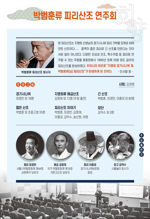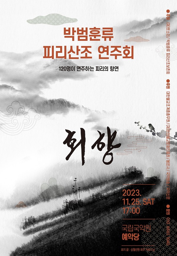 (서울=뉴스코리아) 박지혜 기자 = 박범훈류 피리산조 보존회(회장 : 송선원)가 2023년 11월 25일(토) 17:00 국립국악원 예악당에서 박범훈류 피리산조 연주회 '회향'을 올린다.