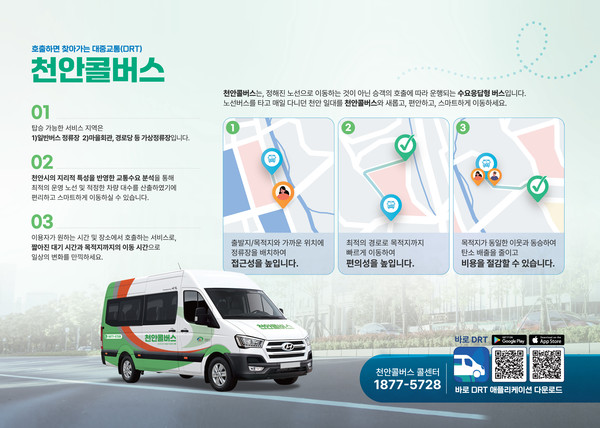 천안콜버스란 수요응답형교통 대중교통 서비스(DRT·Demand Responsive Transport)로 일정한 노선과 운행 시간표 없이 승객의 실시간 호출 수요에 따라 노선과 시간 등을 탄력적으로 설계·운행한다.